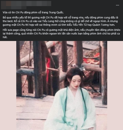 Có fanpage còn đăng tải ảnh và khẳng định Chi Pu rất hợp cổ trang, thậm chí có thể đóng cung đấu. Chi Pu hợp vào những kiểu vai thông minh, cá tính như Tiểu Yến Tử hay Quách Tương, thậm chí cân đẹp cả vai Tiểu Long Nữ.
