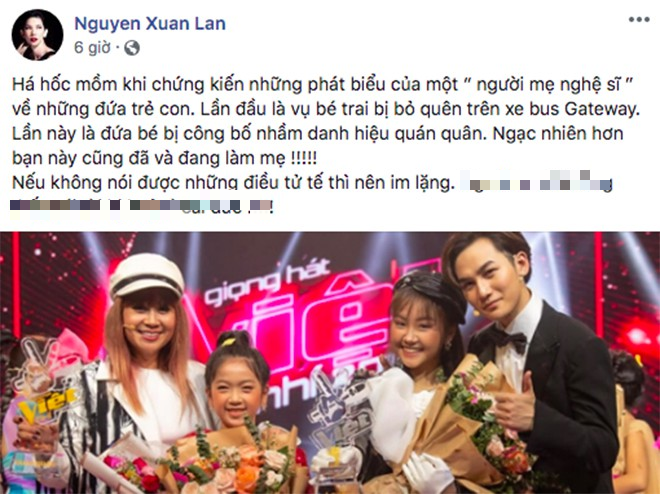 Lần đầu là vụ bé trai bị bỏ quên trên xe bus Gateway. Lần này là đứa bé bị công bố nhầm danh hiệu quán quân. Ngạc nhiên hơn bạn này cũng đã và đang làm mẹ. Nếu không nói được những điều tử tế thì nên im lặng...".