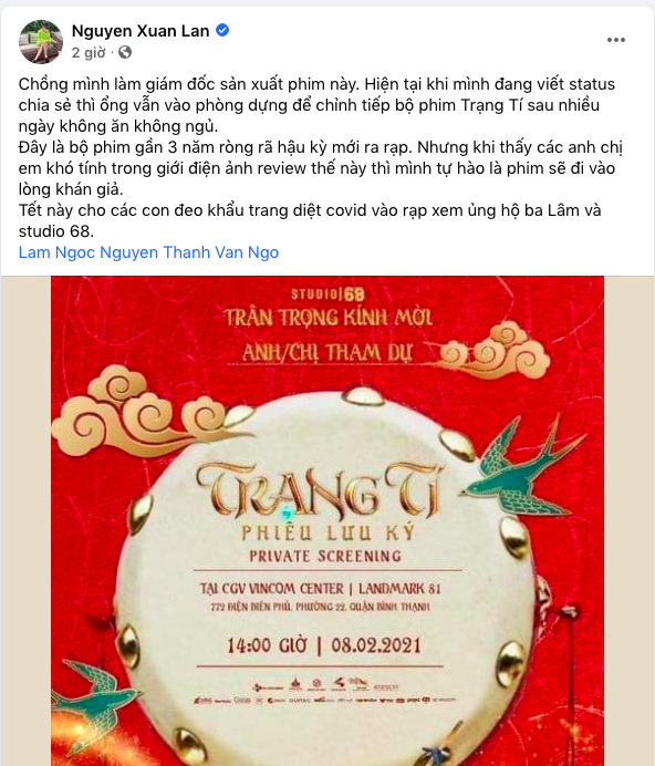 Sau sự kiện chiếu sớm của Trạng Tí, bạn thân Ngô Thanh Vân là siêu mẫu Xuân Lan đã đăng đàn ủng hộ bộ phim. Thông qua trang cá nhân, Xuân Lan chia sẻ rằng cô mong khán giả sẽ tiếp nhận bộ phim với cái nhìn tích cực. Đồng thời, Xuân Lan cũng hé lộ chuyện chồng cô là giám đốc sản xuất của dự án Trạng Tí. Trong thời điểm nhà nhà người người còn tẩy chay phim thì chồng Xuân Lan vẫn bận rộn với công tác hậu kỳ của phim.
