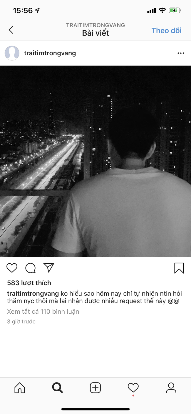 Và bất ngờ chưa kìa, tài khoản "traitimtrongvang" với thông tin liên quan đến chuyện nhắn tin hỏi thăm người yêu cũ dạo này còn hút thuốc không đã xuất hiện trên Instagram. Chẳng biết đây có phải là chiêu PR của ekip Bích Phương tung ra để đẩy sức nóng cho MV hay không nhưng không ít khán giả đã vào trang cá nhân của tài khoản này để bình luận.