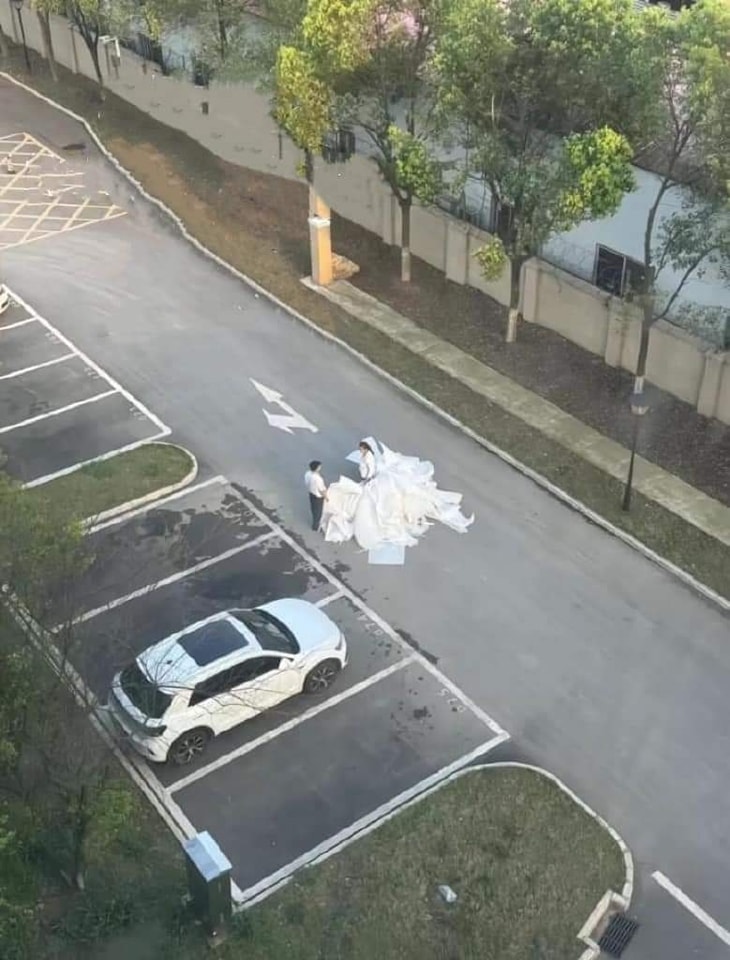 Trên thực tế, hai người trong tấm hình này là bác bảo vệ và cô lao công. Xung quanh người cô lao công là rác - loại túi bỏng và bìa màu trắng,... Vô tình thế nào lại được xếp xung quanh người cô lao công cũng đang mặc đồ màu trắng, nên nhìn từ xa nhiều người dễ nhầm lẫn đây là cảnh một cô dâu đang đứng bên chú rể của mình.