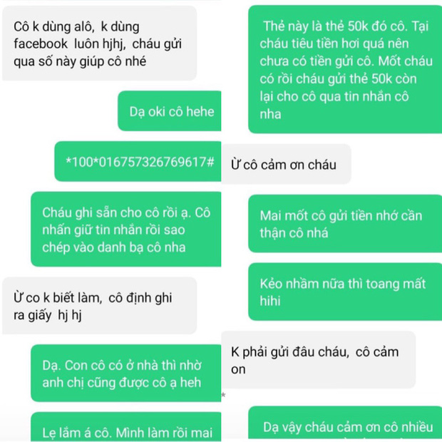 Hơi ngại vì còn thiếu của cô 50.000 đồng, em hẹn ít bữa nữa có tiền sẽ nạp nốt cho cô số tiền còn lại, nhưng bất ngờ là cô bảo: "Không phải gửi đâu cháu, cô cảm ơn" - Trần Hà kể.