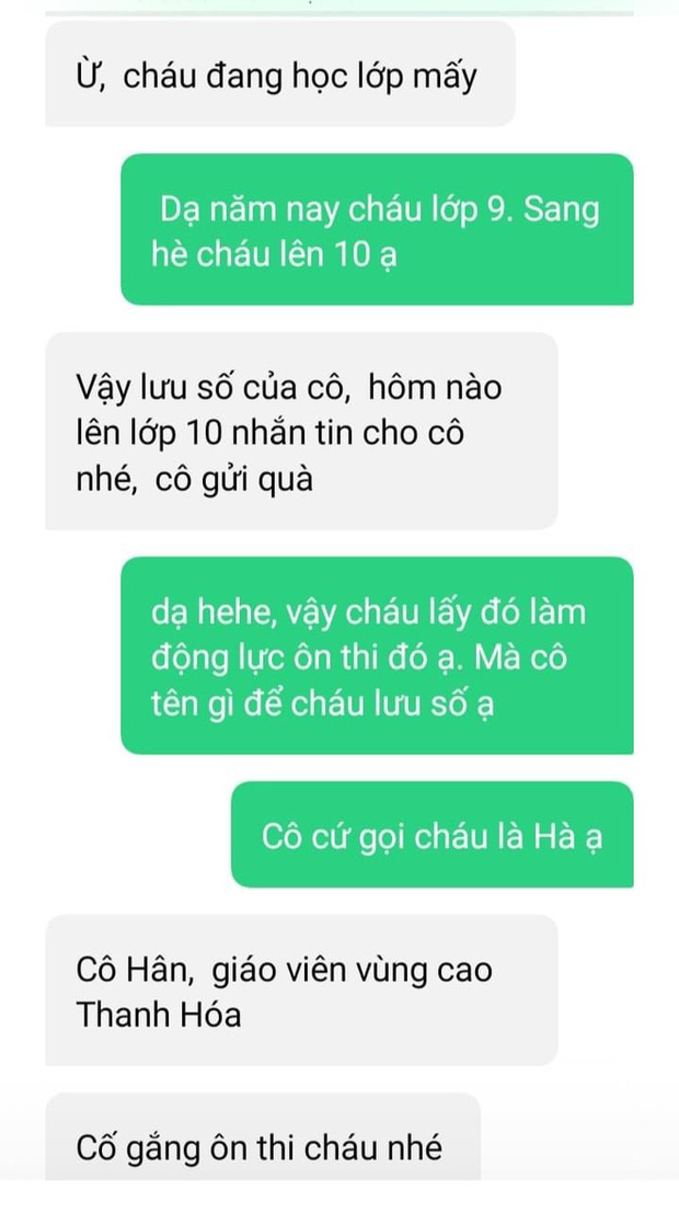 Bất ngờ hơn cả là, sau khi biết Trần Hà đang là học sinh lớp 9, cô giáo đã không quên chúc cô nàng thi tốt nghiệp thật tốt và hứa: "Hôm nào lên lớp 10 nhắn tin cho cô nhé, cô gửi quà".