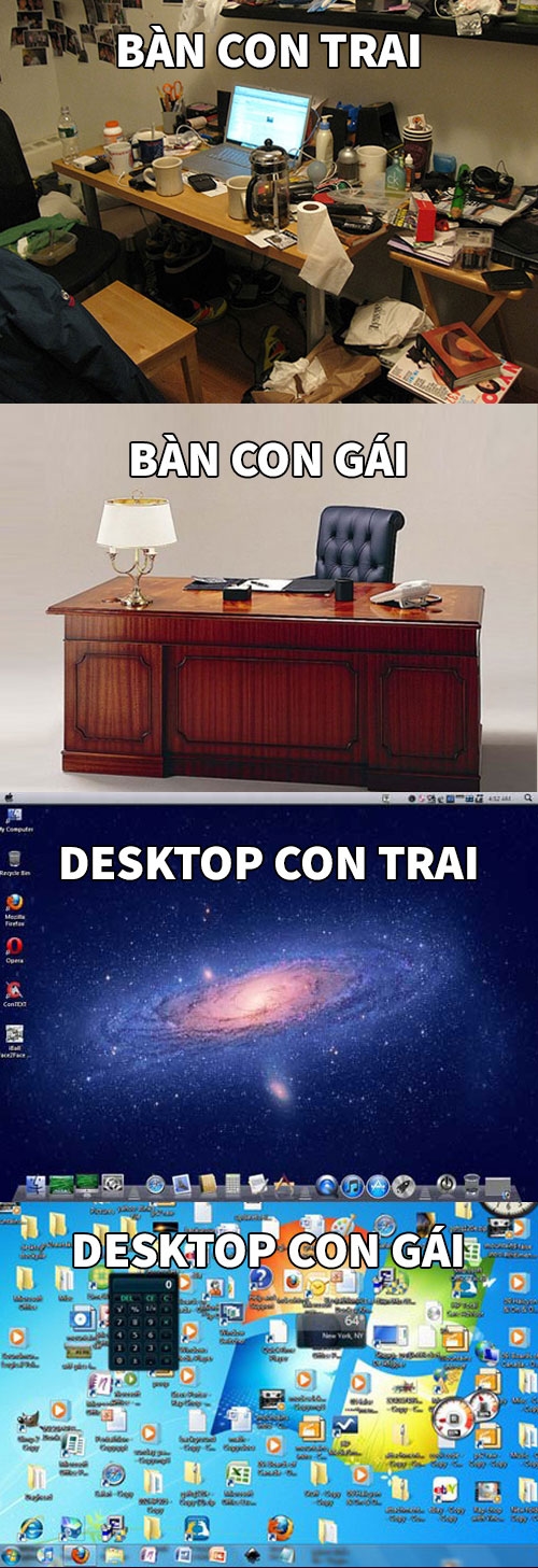 Phụ nữ có bàn học/ làm việc rất gọn gàng, nhưng máy tính của các nàng thì hầu như không ai khác có thể chịu đựng được trừ chính họ. Đàn ông thì ngược lại. |