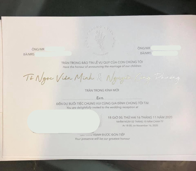 Ngày 16/11 tới đây, Công Phượng sẽ chính thức về chung một nhà với bà xã Viên Minh (tên đầy đủ là Tô Ngọc Viên Minh, SN 1993). Dù chỉ còn 10 ngày nữa đám cưới của Công Phượng sẽ diễn ra nhưng thứ duy nhất người ta biết được vỏn vẻn là "tấm thiệp mời trên bàn, thời gian địa điểm rõ ràng" nên dân tình càng háo hức hóng hớt hơn bao giờ hết.