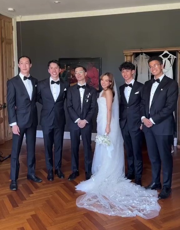 Theo đó, sau khi mặc váy cưới và trang điểm xong xuôi, cô dâu đã gặp nhóm bạn thân khác giới của mình để chụp ảnh. Những anh chàng này cũng chính là phù rể nên ai nấy đều ăn mặc cực kỳ bảnh bao với vest đen và đeo nơ