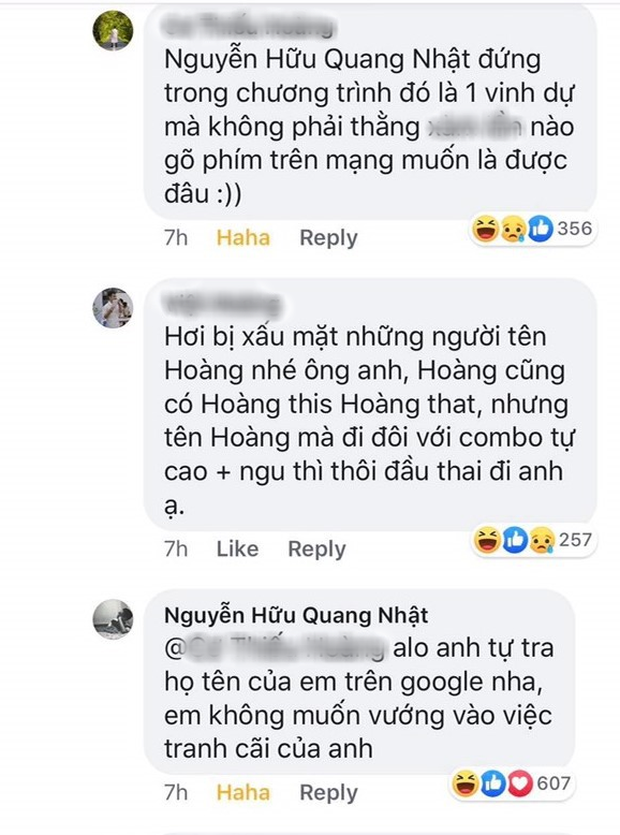 Nhưng rất tiếc cho Hoàng, Nguyễn Hữu Quang Nhật chẳng phải một cư dân mạng ất ơ nào đó mà lại là nhân vật "có số má" tại Đường lên đỉnh Olympia. Trước sự thách thức của Cơ Thiếu Hoàng, Quang Nhật chỉ thả nhẹ một link bài báo viết về mình với tiêu đề: "Nguyễn Hữu Quang Nhật đầy tự tin bước vào vòng Chung kết Olympia năm thứ 18". Theo đó, Quang Nhật từng là học sinh trường THPT Phan Chu Trinh, Đà Nẵng.