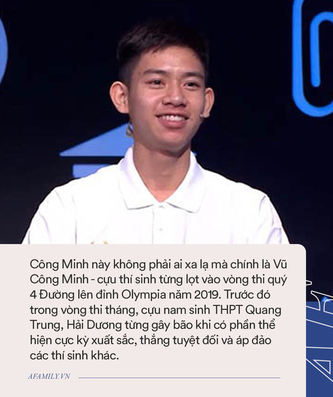 Hóa ra, Công Minh này không phải ai xa lạ mà chính là Vũ Công Minh - cựu thí sinh từng lọt vào vòng thi quý 4 Đường lên đỉnh Olympia năm 2019. Trước đó trong vòng thi tháng, cựu nam sinh THPT Quang Trung, Hải Dương từng gây bão khi có phần thể hiện cực kỳ xuất sắc, thắng tuyệt đối và áp đảo các thí sinh khác. Cụ thể cậu bạn đạt 330 điểm, hơn người về nhì tới 125 điểm.