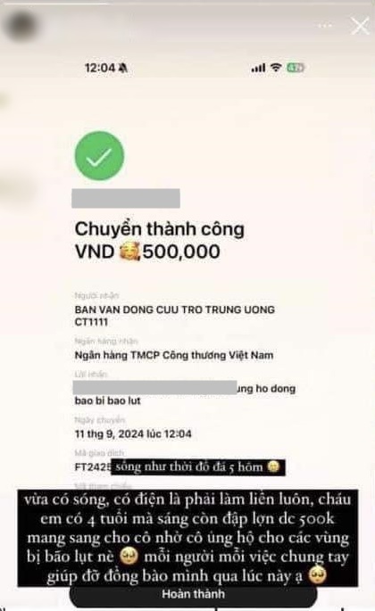 Người tiếp theo khiến cư dân mạng quan tâm là N.H - một hot girl đến từ Hạ Long. Trước đó cô đăng story khoe ủng hộ con số tiền triệu và chú thích: “Vừa có sóng, có điện là phải làm liền luôn. Cháu em có 4 tuổi mà sáng còn đập lợn được 500k mang sang cho cô nhờ cô ủng hộ cho các vùng vị bão lụt nè. Mỗi người một việc chung tay giúp đỡ đồng bào mình qua lúc này ạ”.