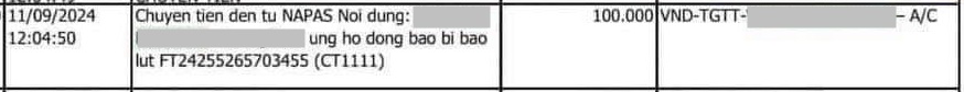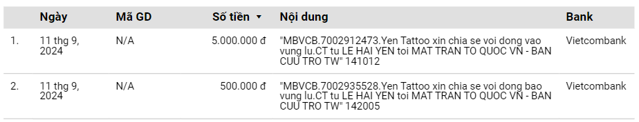 Theo đó Yến Tattoo từng khoe bill ủng hộ vào ngày 11/9 với nội dung: “Yến Tattoo xin chia sẻ với đồng bào vùng lũ”. Cô dùng icon che đi nhưng nhìn dãy chữ số lấp ló, nhiều người cho rằng con số phải đến hàng trăm triệu đồng. Tuy nhiên đến tối 15/9, cô được phát hiện ra có 1 giao dịch 500.000 đồng, không giống như con số từng được chia sẻ trước đó. Vì vậy nhiều người cho rằng cô nàng đã “phù phép” lên hàng trăm triệu, để lại nhiều bình luận chê cười “phông bạt”.