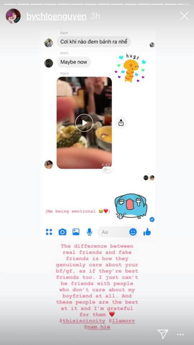 Mọi chuyện bắt đầu được chú từ một story của Chloe: "Sự khác biệt giữa những bạn tốt và bạn giả tạo là cách họ quan tâm/ chăm sóc thật sự tốt cho bạn trai/bạn gái của mình. Tôi không thể làm bạn với những người mà ko quan tâm đến bạn trai của tôi." (Tạm dịch). Cô nàng tag cảm ơn 1 vài người bạn nhưng tuyệt đối không có An Phương.