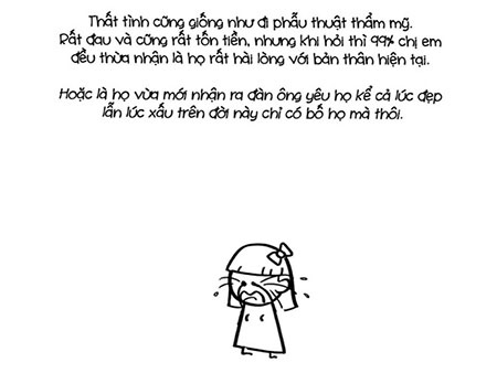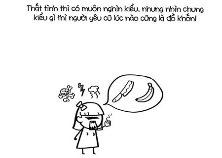 Mới đây, nhóm họa sĩ Lê Bích (gồm 3 bạn trẻ sống tại Hà Nội - Lê Sơn Tùng, Đinh Phương Linh và Trần Tuấn Linh) đăng tải bộ tranh Thất tình không khó, liệt kê những định nghĩa hóm hỉnh về vấn đề được nhắc nhiều trong giới trẻ - thất tình. |