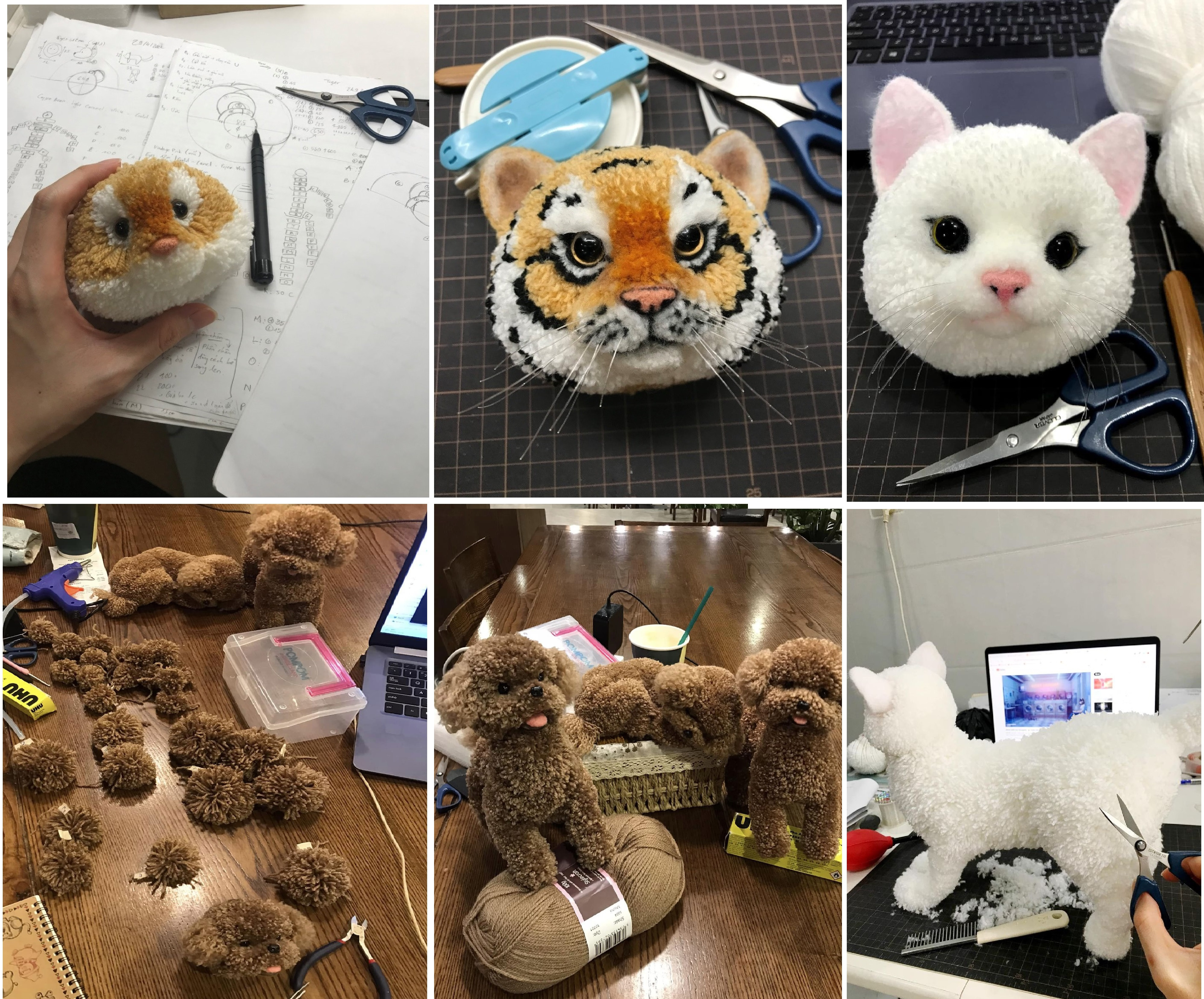 Để đôi tai, mắt, mũi… toát lên được hồn của con vật thì người làm pompom ngoài việc biết dùng phụ kiện còn phải hiểu căn bản về giải phẫu động vật. Vì thế, trước khi bắt tay vào làm Huy nghiên cứu quan sát kỹ đặc điểm của mẫu vật định làm. Tiếp theo, Huy sẽ vẽ phác họa và dựng biểu đồ (diagram) để sắp xếp các tầng lớp len rồi quấn sợi len lên khuôn pompom.