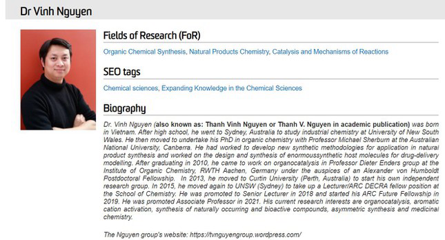 Sau đó, anh quay lại Australia để giảng dạy bộ môn Hóa tại ĐH Curtin, TP Perth và giành được cơ số giải thưởng trong lĩnh vực nghiên cứu mà mình theo đuổi.