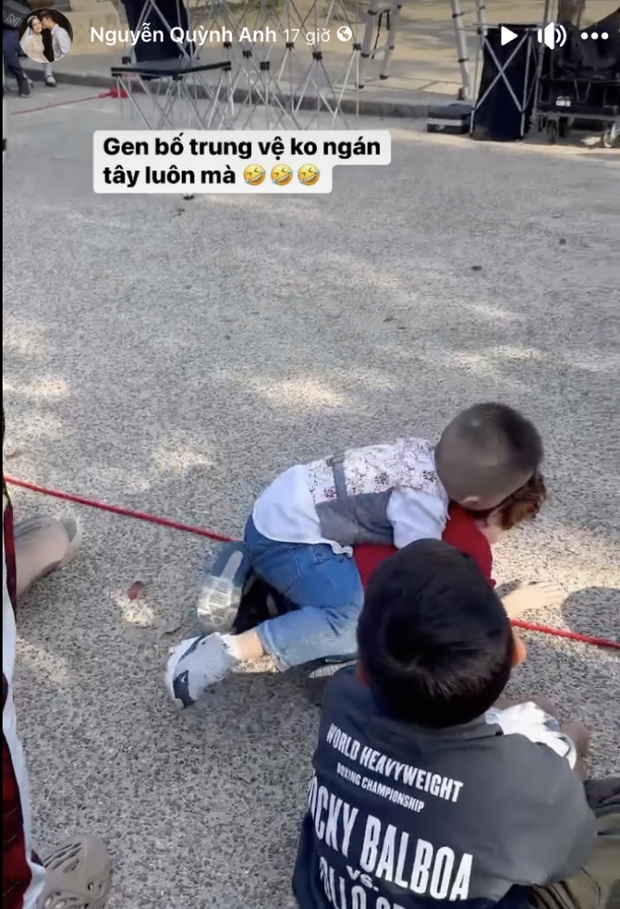 Trong đó, có khoảnh khắc ái nữ nhà cựu Chủ tịch CLB Sài Gòn khoe con trai có gen của bố là trung vệ nổi tiếng. Bé Ú vui đùa cùng một nhóc tỳ cùng trang lứa và áp sát, không thua kém khi tranh chấp. Quỳnh Anh cảm thán: "Gen bố trung vệ không ngán Tây luôn mà", đồng thời tag tên của Duy Mạnh.
