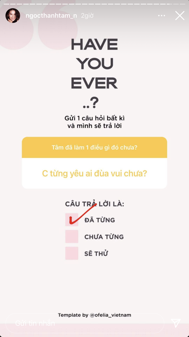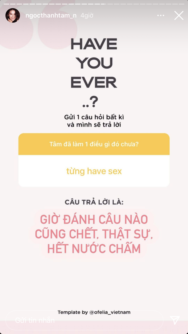 Cụ thể, khi một dân mạng hỏi thẳng đã từng "have sex" chưa, ái nữ không phủ nhận mà cũng chẳng thừa nhận: "Giờ đánh câu nào cũng chết. Thật sự hết nước chấm". Được đà, một người bạn của Ngọc Thanh Tâm lại hỏi thêm đã từng làm chuyện này trên bờ biển chưa. Trả lời cho cho câu hỏi, cô nàng mạnh dạn tick vào ô "sẽ thử".