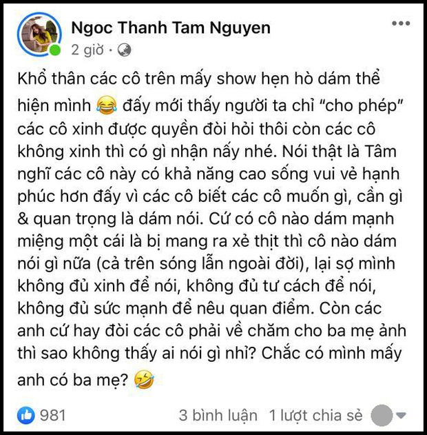 "Khổ thân các cô trên mấy show hẹn hò dám thể hiện mình. Đấy mới thấy người ta chỉ 'cho phép' các cô xinh được quyền đòi hỏi thôi còn các cô không xinh thì có gì nhận nấy nhé. Nói thật là Tâm nghĩ các cô này có khả năng cao sống vui vẻ hạnh phúc hơn đấy vì các cô biết các cô muốn gì, cần gì và quan trọng là dám nói. Cứ có cô nào dám mạnh miệng một cái là bị mang ra xẻ thịt thì cô nào dám nói gì nữa (cả trên sóng lẫn ngoài đời), lại sợ mình không đủ xinh để nói, không đủ tư cách để nói, không đủ sức mạnh để nêu quan điểm. Còn các anh cứ hay đòi các cô phải về chăm cho ba mẹ ảnh thì sao không thấy ai nói gì nhỉ? Chắc có mình mấy anh có ba mẹ?".