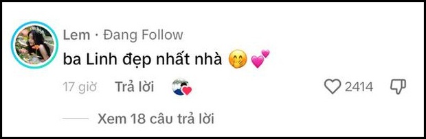 Tuy nhiên không quá để ý đến những lời khen này, Lọ Lem lại bình luận phía dưới clip: "Ba Linh đẹp nhất nhà".