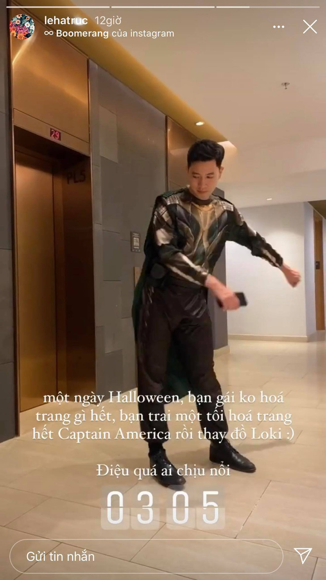 Về phần mình, Hà Trúc cũng không ngại "bóc" người yêu vì... điệu: "Một ngày Halloween, bạn gái không hoá trang gì hết, bạn trai một tối hoá trang hết Captain America rồi thay đồ Loki. Điệu quá ai chịu nổi".