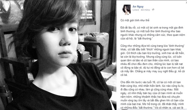 Vào khoảng tháng 9/2014, An Nguy đã đăng status rất dài có tựa đề: "Có một giới tính như thế", ngay lập tức thu hút sự chú ý của cư dân mạng. Trong status, cô viết về một người "sinh ra trong một gia đình bình thường", nhưng lại "có những cảm xúc theo quan niệm của xã hội là bất thường".