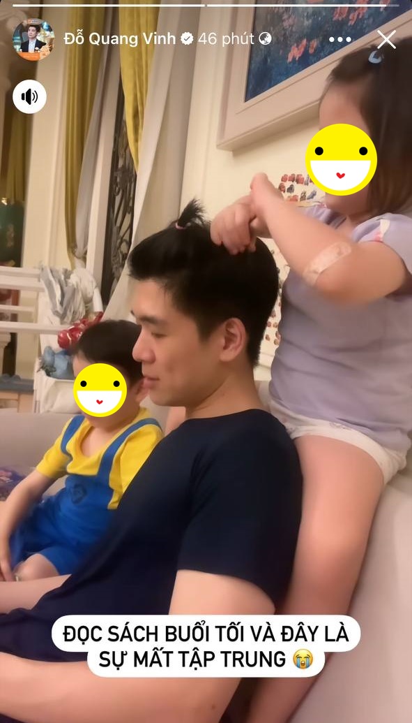 Sau đó, anh tranh thủ còn đọc sách buổi tối cho 2 con. Trong khi bé Gấu tập trung nghe và trả lời ba thì bé Thỏ lại ngồi lên thành ghế để buộc tóc cho ba. Kết quả sau màn nghịch ngợm của Thỏ là hình ảnh hài hước của phó Tổng, trái ngược với sự nghiêm túc lúc đi làm.