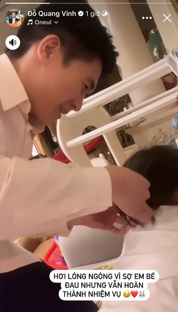 Khi đi làm về còn mặc nguyên áo sơ mi nhưng Quang Vinh vẫn cẩn thận buộc tóc cho con gái. “Hơi lóng ngóng vì sợ em bé đau nhưng vẫn hoàn thành nhiệm vụ” - bố đơn thân chia sẻ.