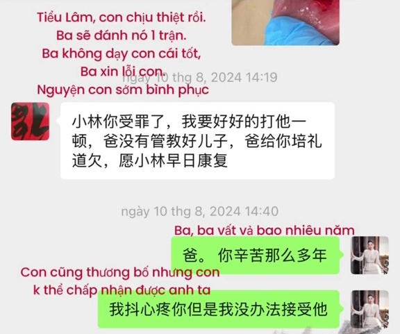 Theo ảnh chụp màn hình, Hằng Du Mục nhắn tin cho bố chồng từ ngày 10/8 - thời điểm cô bị bạo hành. Cô chụp cận cảnh những vết thương mà mình đang chịu và kể lại chuyện đã xảy ra. Cô cũng cho biết mình hiểu bố vất vả nhiều năm qua, rất thương bố nhưng không thể chấp nhận được Tôn Bằng.