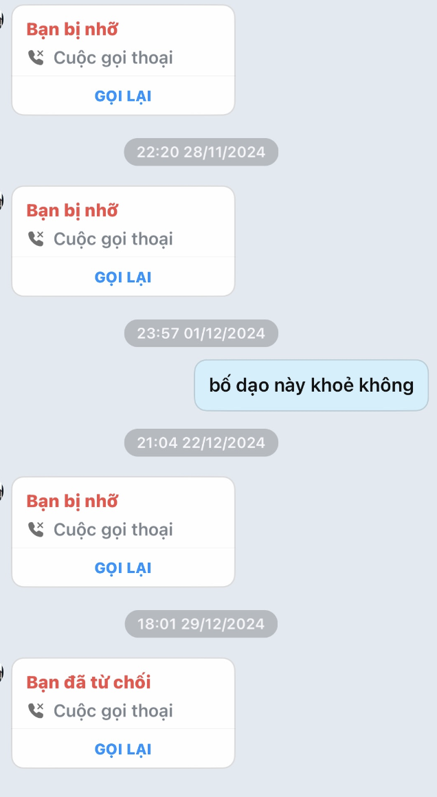 Dưới đây là nhữngc chia sẻ và ảnh chụp màn hình tin nhắn cuộc trò chuyện cuối cùng của những đứa con với bố, mẹ, người thân đã qua đời. Không có gì đặc biệt, chỉ là những cuộc gọi nhỡ, những câu hỏi thăm sức khoẻ, dặn dò ăn uống đầy đủ hàng ngày - điều mà hàng vạn đứa con trên đời này nhận được từ bố mẹ mỗi ngày. Song, điều đặc biệt nhất lại là điều không ai muốn trải qua nhất, đó là: Bạn có thể trả lời tin nhắn ấy bất cứ nào, còn ở phía ngược lại, mãi mãi không có phản hồi. Tất cả đã dừng lại!