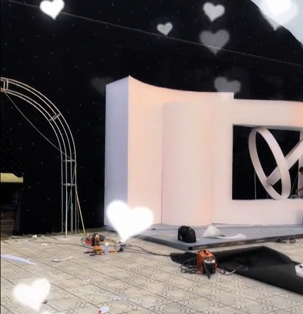 Trong khi đó, một góc sân khấu đang được dựng với tạo hình đôi nhẫn lồng vào nhau, biểu tượng cho sự gắn bó, gắn kết của cặp tình nhân trọn đời. Toàn cảnh, không gian rạp cưới hoành tráng để dự kiến đón tiếp với quy mô khách mời lớn. Được biết, ekip dựng rạp cưới và tổ chức sự kiện được Văn Hậu thuê từ Hà Nội về, chứ không dùng dịch vụ cưới hỏi ở địa phương.