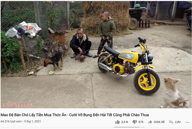 Mao Đệ đi bán chó trên chiếc xe tự chế, không có biển số. Mao Anh đã chuẩn bị hai cây tre để treo chiếc bọc đựng chó cho em mình đi bán. Nhìn hình ảnh chú chó xoay vòng vòng ở sau xe khiến ai cũng xót xa, phẫn nộ với hành động của hai anh em Tam Mao.