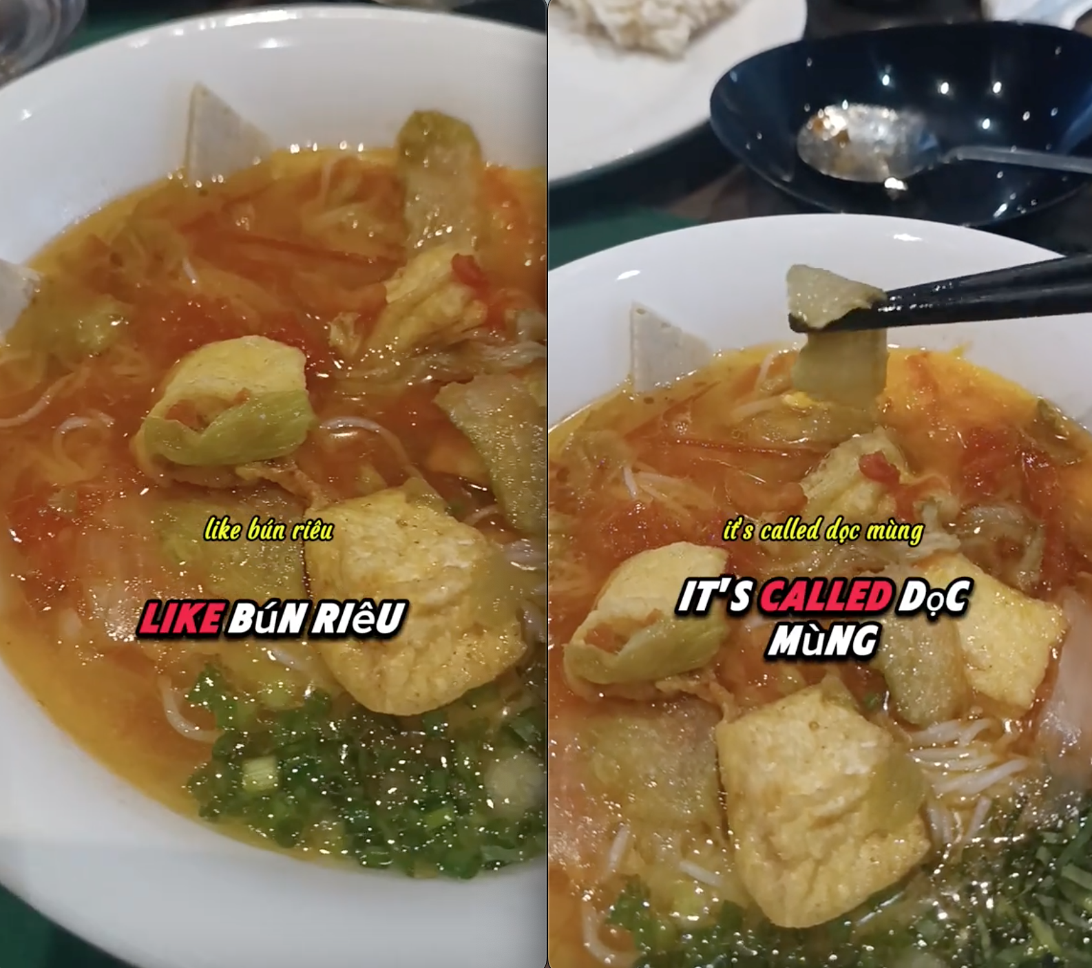 Đặc biệt, điều làm anh thích thú nhất chính là những món bún hay mì chay, với hương vị thanh nhẹ nhưng vẫn đậm đà. Trong đó, bún riêu chay là món khiến anh ấn tượng nhất bởi sự tinh tế trong cách nấu. Dù không có cua, không có thịt, nhưng chỉ với sự kết hợp của đậu phụ, nấm, cà chua và các loại rau thơm, người Việt vẫn tạo ra được một bát bún riêu thơm ngon không kém gì phiên bản gốc. Trong đó, điểm đặc biệt khiến anh chàng Tây này cực kỳ ấn tượng với món bún riêu chay chính là sự góp mặt của nguyên liệu dọc mùng bên trong.