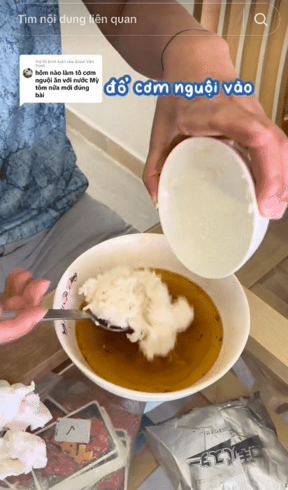 Thậm chí anh chàng còn sẵn sàng vét nốt nồi cơm nguội để ăn cho bằng sạch bát nước mì tôm còn lại. Đúng là món ăn "tốm cơm" nhất từ trước đến giờ mà chàng TikToker này từng thử qua.