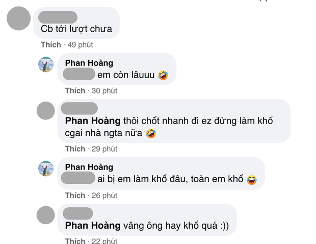 Theo đó, khi người bạn hỏi chuẩn bị tới lượt Phan Hoàng cưới chưa, anh chàng khẳng định chắc như đinh đóng cột rằng còn lâu. Tiếp đến, người bạn này tiếp tục trêu "Đừng làm khổ con gái nhà người ta nữa", thiếu gia liền kể khổ: "Ai bị em làm khổ đâu, toàn em khổ".