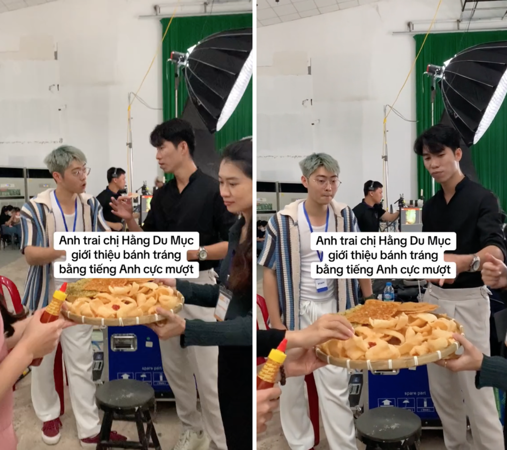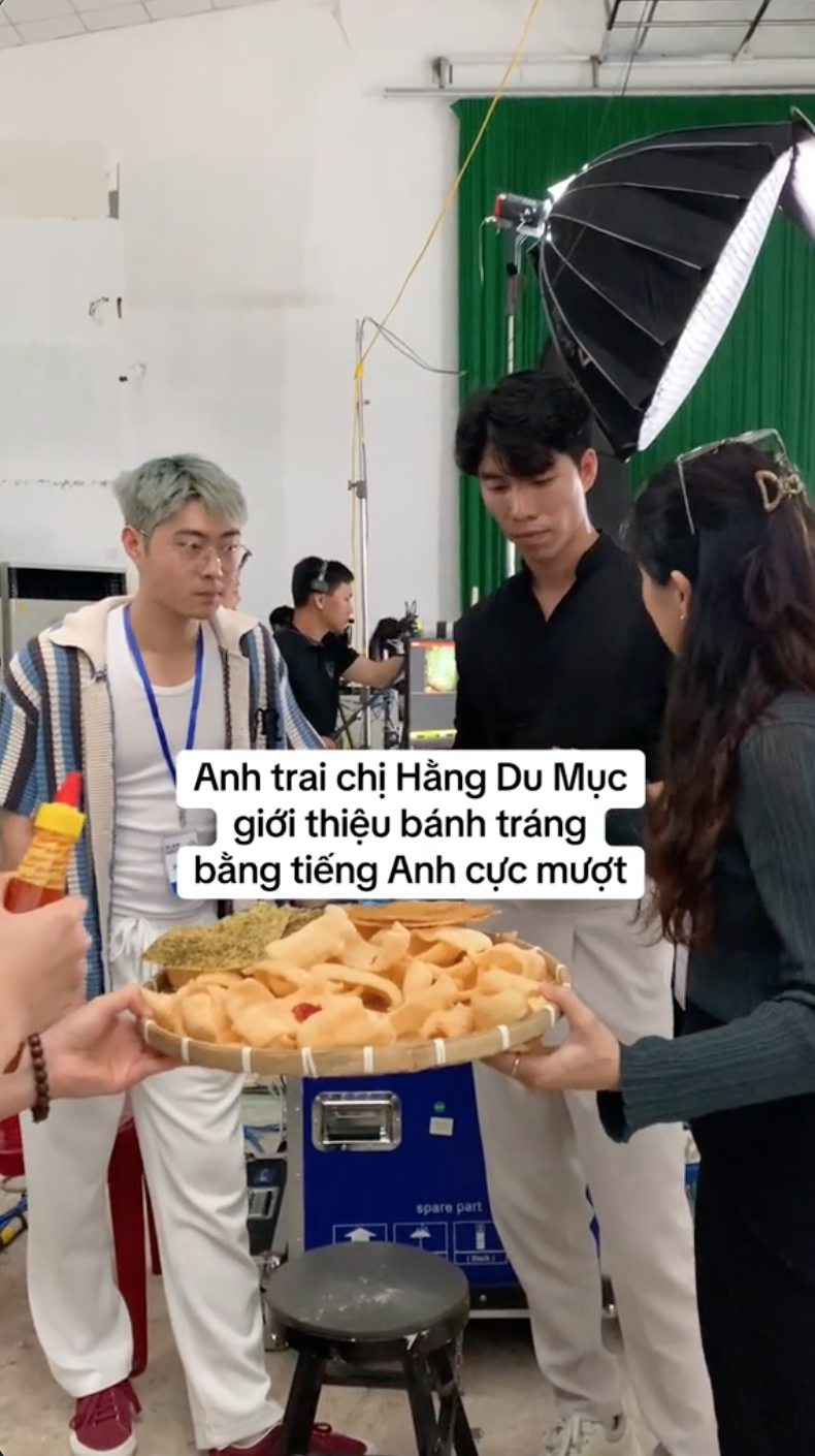 Đặc biệt, mới đây, một đoạn video hậu trường đã ghi lại cảnh anh trai của Hằng Du Mục nói tiếng Anh vô cùng "mượt" để giới thiệu về bánh tráng Việt Nam ngay lập tức nhận về "cơn mưa" lời khen.