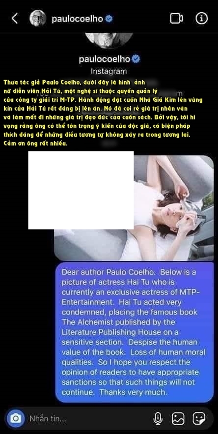 Drama Sơn Tùng - Thiều Bảo Trâm - Hải Tú không có thêm diễn biến nào mới, tuy nhiên, việc các anti-fan tiếp tục tấn công Hải Tú trên mọi mặt trận thì vẫn chưa "hạ nhiệt". Mới đây, các anti-fan còn đầu tư, làm hẳn một đoạn tin nhắn tiếng Anh gửi đến tác giả Paulo Coelho - tác giả của quyển sách nổi tiếng Nhà Giả Kim.