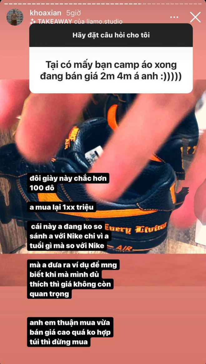 Về phía shop local brand, Khoa Xian - chủ shop đã bày tỏ quan điểm của mình ở phần Q&A khi dân mạng ý kiến về chuyện đôn giá. Khoa Xian cho biết vì những người bỏ công đi camp (xếp hàng từ sớm) mua trực tiếp về bán, ai thấy thích thì mua chứ không phải mình đôn giá.