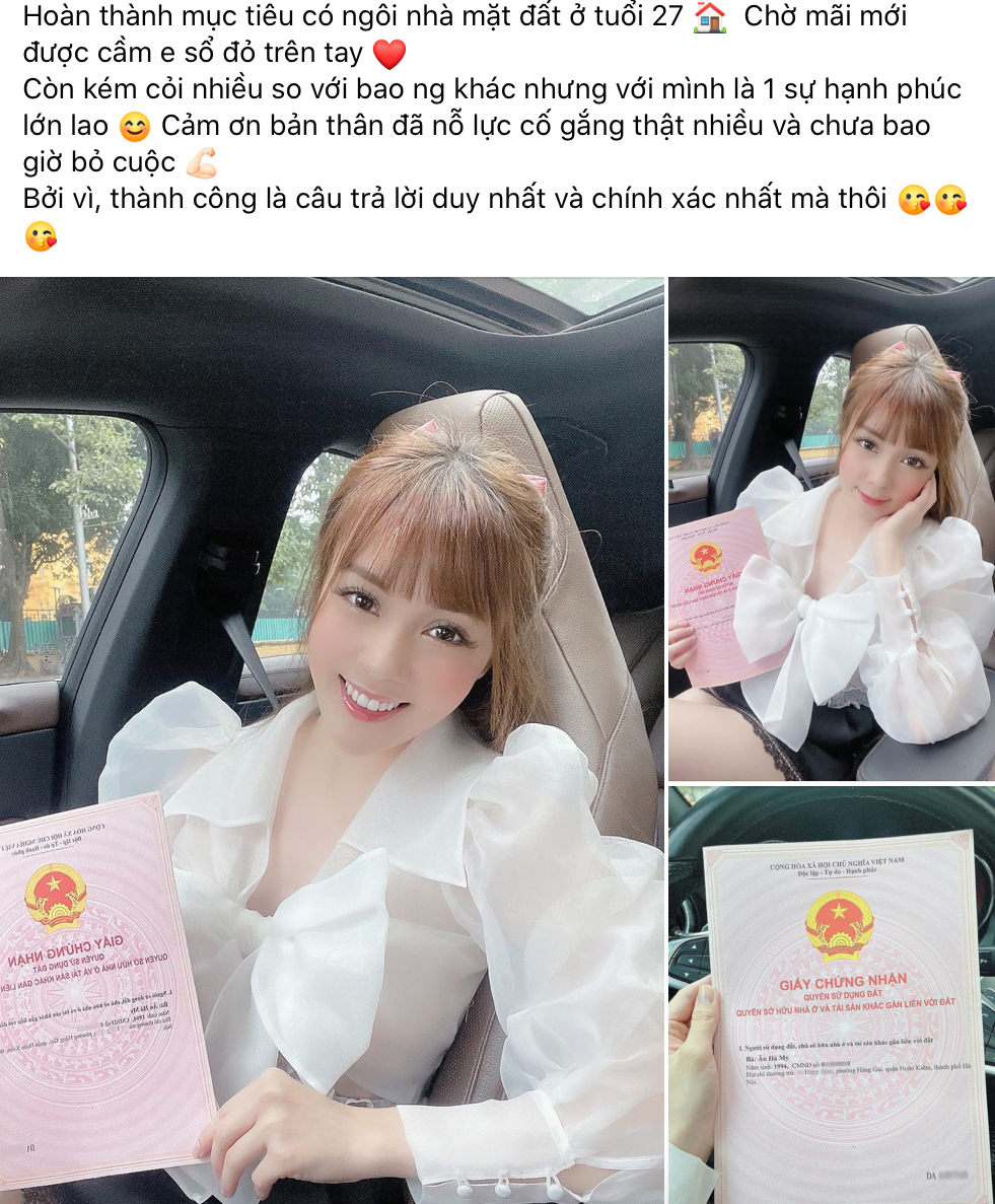 Mới đây, cô nàng còn hãnh diện khoe chiếc sổ đỏ trên trang cá nhân. Nữ giảng viên cho biết hiện tại đã hoàn thành mục tiêu "có nhà mặt đất" ở tuổi 27, điều mà không phải cô gái nào cũng làm được. Qua đó, cô còn khẳng định tinh thần thép "thành công là câu trả lời duy nhất và chính xác nhất".