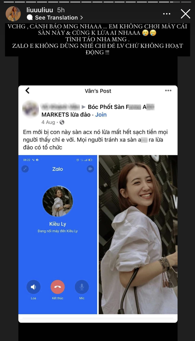 "Cảnh báo mọi người nha!!! Em không chơi mấy cái sàn này và cũng không lừa ai, tỉnh táo nha mọi người. Zalo em không dùng nhé, chỉ để làm việc chứ không hoạt động!!!", Kiều Ly viết.