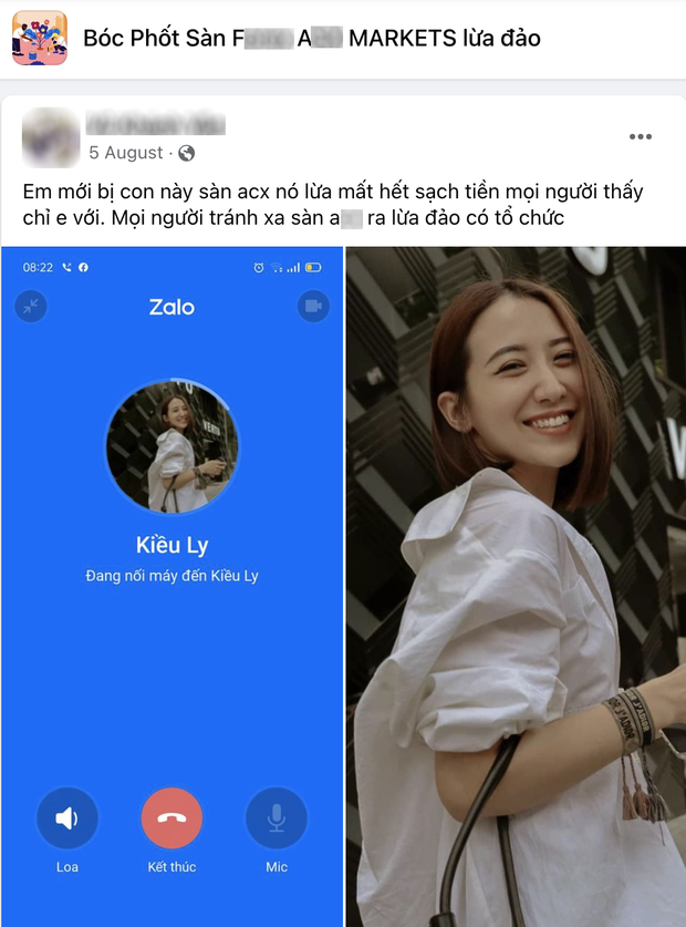 Theo đó, Kiều Ly vừa bị gọi tên trong một group chuyên bóc phốt các hoạt động lừa đảo của một sàn giao dịch tên A. Người bóc phốt còn đính kèm hình selfie cũng như ảnh chụp cuộc gọi hiển thị tên Kiều Ly để làm bằng chứng. Theo người này, "bà chủ Hà thành" đã lừa hết tiền của mình nên hy vọng mọi người có thấy Kiều Ly ở đâu thì chỉ mình, đồng thời không quên cảnh báo mọi người tránh xa sàn A. để tránh trường hợp tương tự.