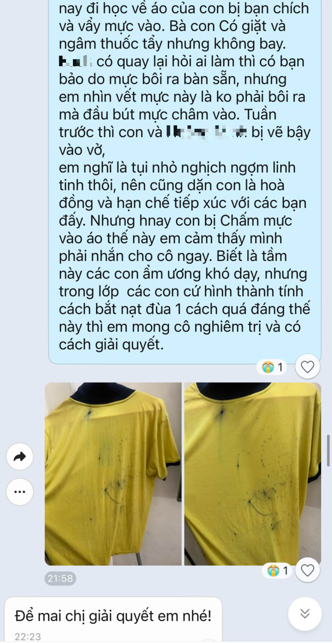 Đính kèm bài viết là hình ảnh một chiếc áo bị chấm bút bi. Chị kể con mình đi học nhóm con bị bạn chấm đầu bút bi vào chiếc áo còn mới, con khóc vì bao công bà nội giặt, con gìn giữ để bà đỡ mất công. Chị đến gặp cô chủ nhiệm thì cô cũng giải quyết qua loa, không tìm ra thủ phạm, và cũng chỉ bảo các bạn lần sau không được làm như thế. Ấm ức lâu ngày mà ở lớp cô cũng không giải quyết được, con cứ dồn về nhà tâm sự với bà nội và mẹ.