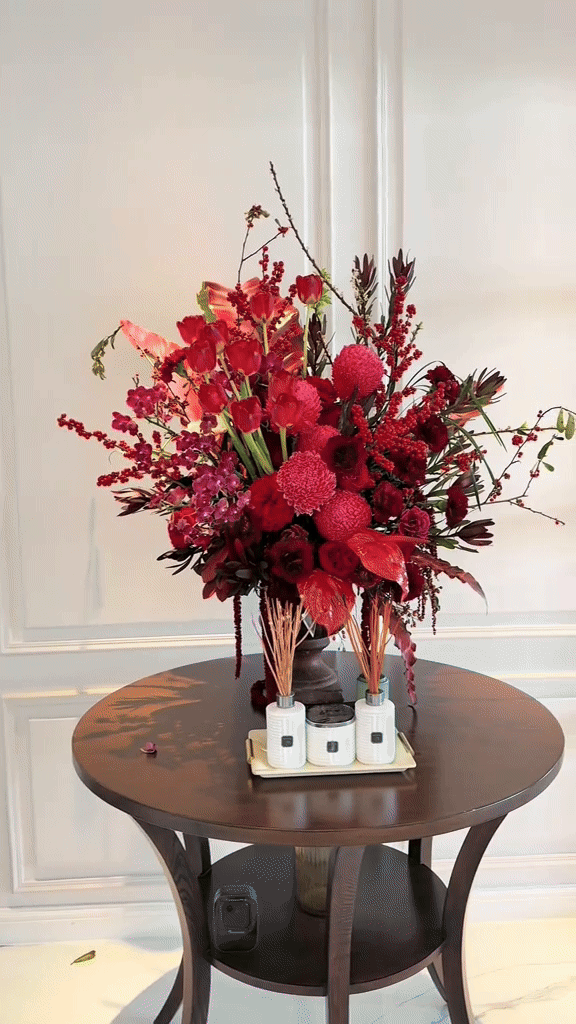Không dừng lại ở đó, nữ CEO và bạn bè còn khéo léo trang trí thêm một bàn hoa, đặt ngay cạnh bình hoa đào. Sự kết hợp tinh tế giữa sắc hồng ngọt ngào và sắc đỏ rực rỡ tạo nên một không gian tuyệt đẹp, tươi mới và đầy sức sống.