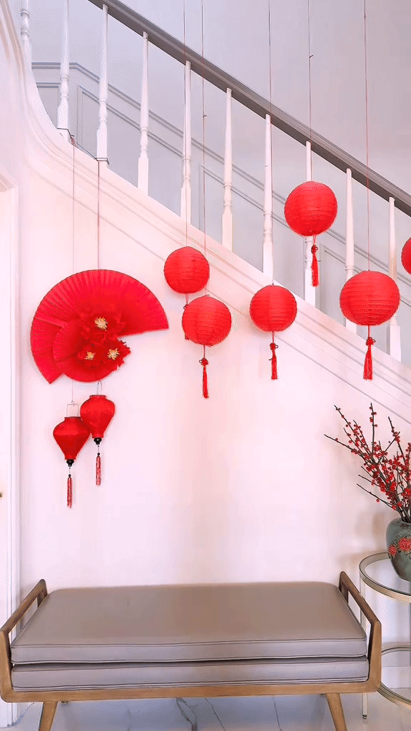 Khu vực cầu thang nhà Hannah cũng được decor tinh tế để tràn ngập sắc xuân. Nữ doanh nhân không trang trí cầu kỳ mà chỉ treo đèn lồng và quạt giấy đỏ, tạo nên vẻ đẹp đơn giản nhưng đầy ấn tượng.