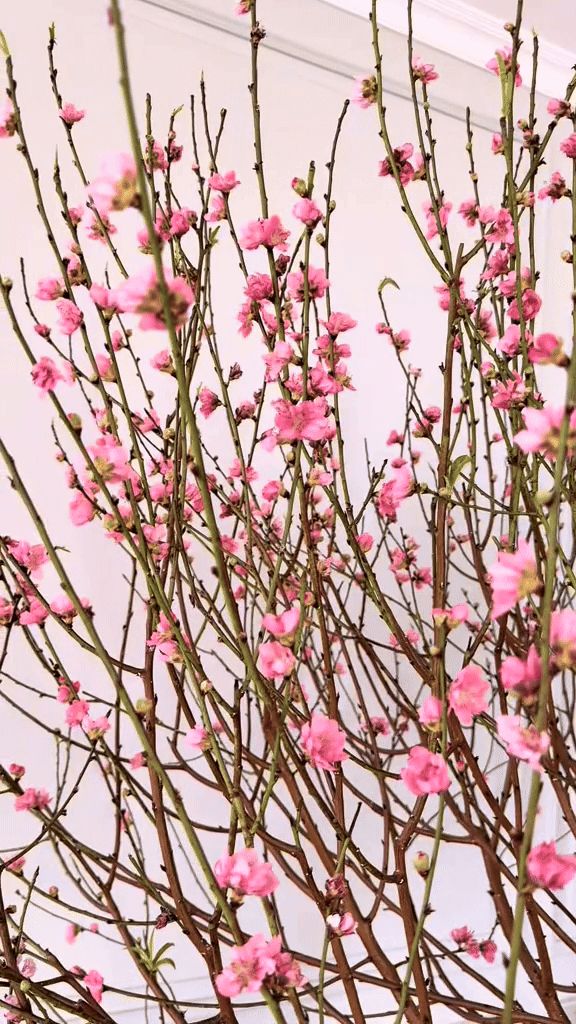 Bình hoa đào nhỏ xinh được Hannah Olala đặt trên ghế, nụ hoa nở rực rỡ phủ hồng một góc nhà.