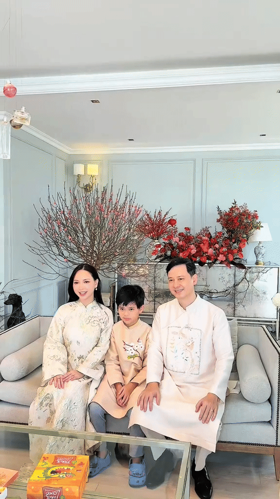 Nhân dịp bạn bè ghé thăm, gia đình Hannah đã cùng nhau tụ tập để chụp hình Tết. Năm nay, "dress code" mà gia đình nữ doanh nhân lựa chọn là áo dài màu kem, nhẹ nhàng nhưng rất tinh tế, sang trọng.