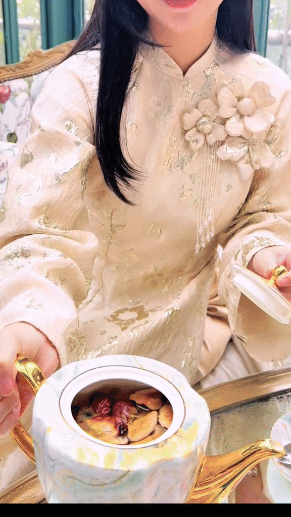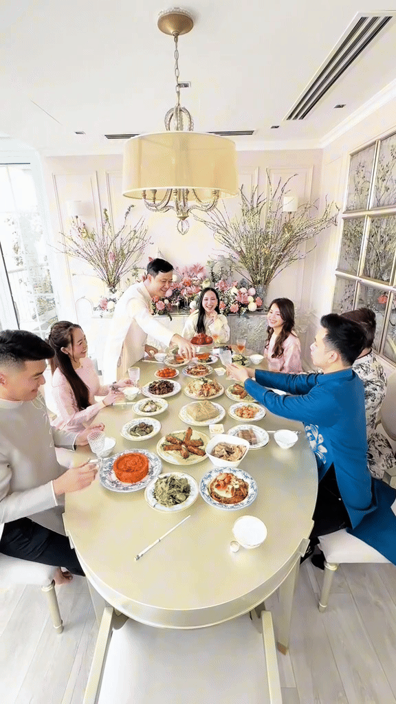Sau buổi chụp hình, gia đình và bạn bè Hannah Olala cùng nhau nhập tiệc đón Tết và thưởng trà trong không gian ấm áp, vui vẻ.