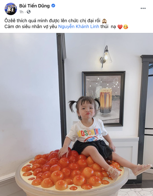 Hiện tại, trung vệ của CLB Viettel đang trong thời gian tập trung cùng đội tuyển quốc gia nhằm chuẩn bị cho kỳ thi đấu sắp tới. Dù xa nhà nhưng khi nhận được tin vui to đùng này, Bùi Tiến Dũng vẫn lập tức đăng ảnh khoe, đồng thời không quên cảm ơn "siêu nhân vợ yêu". Như vậy, Bùi Tiến Dũng sẽ chính thức gia nhập hội bố bỉm sữa 2 con, và bé Sushi 2 tuổi cũng lên chức "chị đại" trong gia đình.
