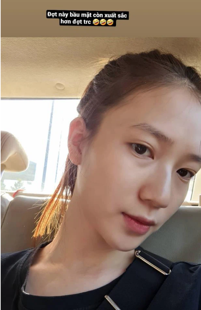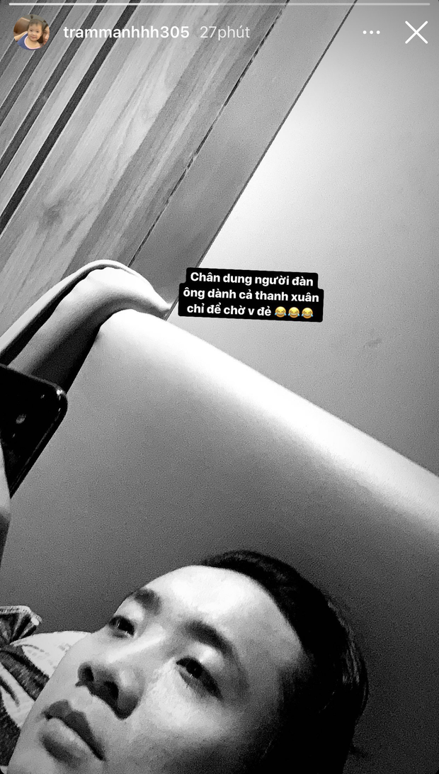 Điều khiến nhiều người thích thú hơn nữa là dù sắp sinh nhưng Trâm Anh không quên "dìm hàng" chồng. Trên Instagram cá nhân, cô đăng story chụp cận mặt của người chồng nổi tiếng kèm caption: "Chân dung người đàn ông dành cả thanh xuân chỉ để chờ vợ đẻ".