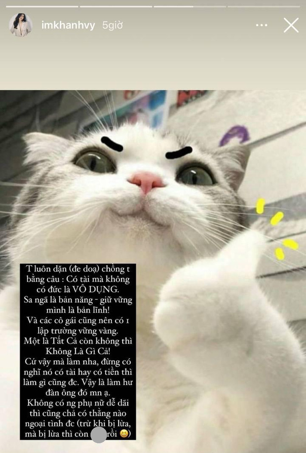 Và các cô gái cũng nên có 1 lập trường vững vàng. Một là tất cả còn không thì không gì cả! Cứ vậy mà làm nha, đừng có nghĩ nó có tài hay có tiền thì làm gì cũng được. Vậy là làm hư đàn ông đó mọi người ạ. Không có người phụ nữ dễ dãi thì cũng chả có thằng nào ngoại tình được (trừ khi bị lừa)".