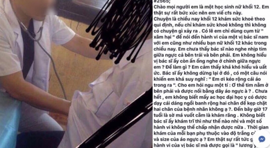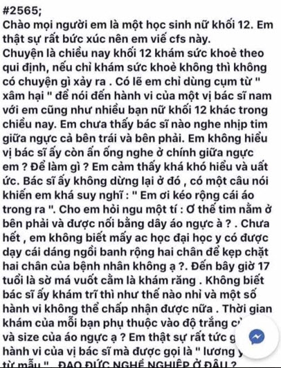 Chuyện là chiều nay, khối 12 khám sức khỏe theo quy định. Nếu chỉ khám không thì không có chuyện gì xảy ra. Có lẽ em chỉ dùng một cụm từ “xâm hại” để nói đến hành vi của một vị bác sĩ nam với em cũng như nhiều bạn nữ khối 12 khác trong chiều nay. Em chưa thấy bác sĩ nào nghe nhịp tim giữa cả bên ngực trái và bên phải. Em không hiểu bác sĩ ấy còn ấn ống nghe ở chính giữa ngực em để làm gì? Em cảm thấy khó hiểu và uất ức.