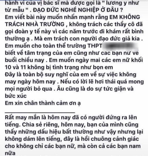 Em viết bài này muốn nhấn mạnh rằng, em không muốn trách nhà trường, không trách các thầy cô đã gọi đoàn y tế này vì những năm trước đi khám vẫn bình thường ạ. Em trách con người đạo đức giả kia. Em muốn cho toàn thể trường THPT L. biết về tâm trạng của em cũng như các bạn về buổi chiều nay. Em muốn ngày mai các bạn nữ khối 10 và 11 không bị tình trạng như bọn em.